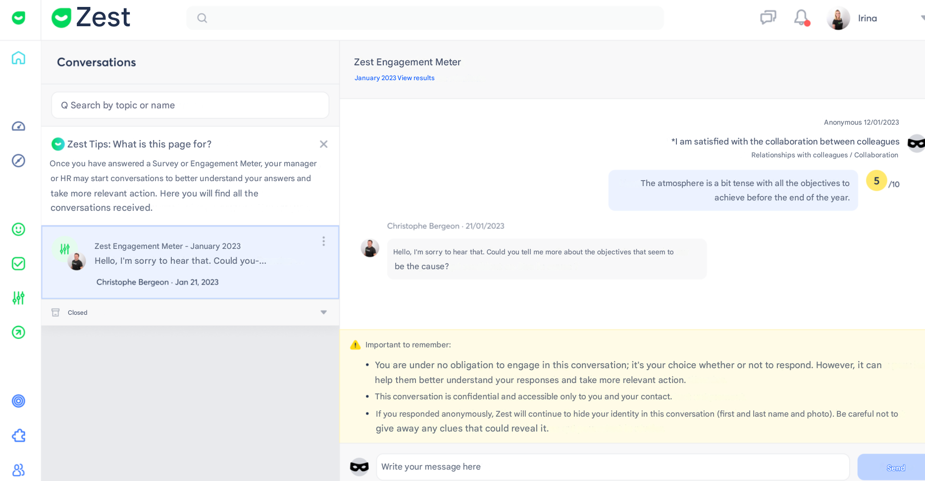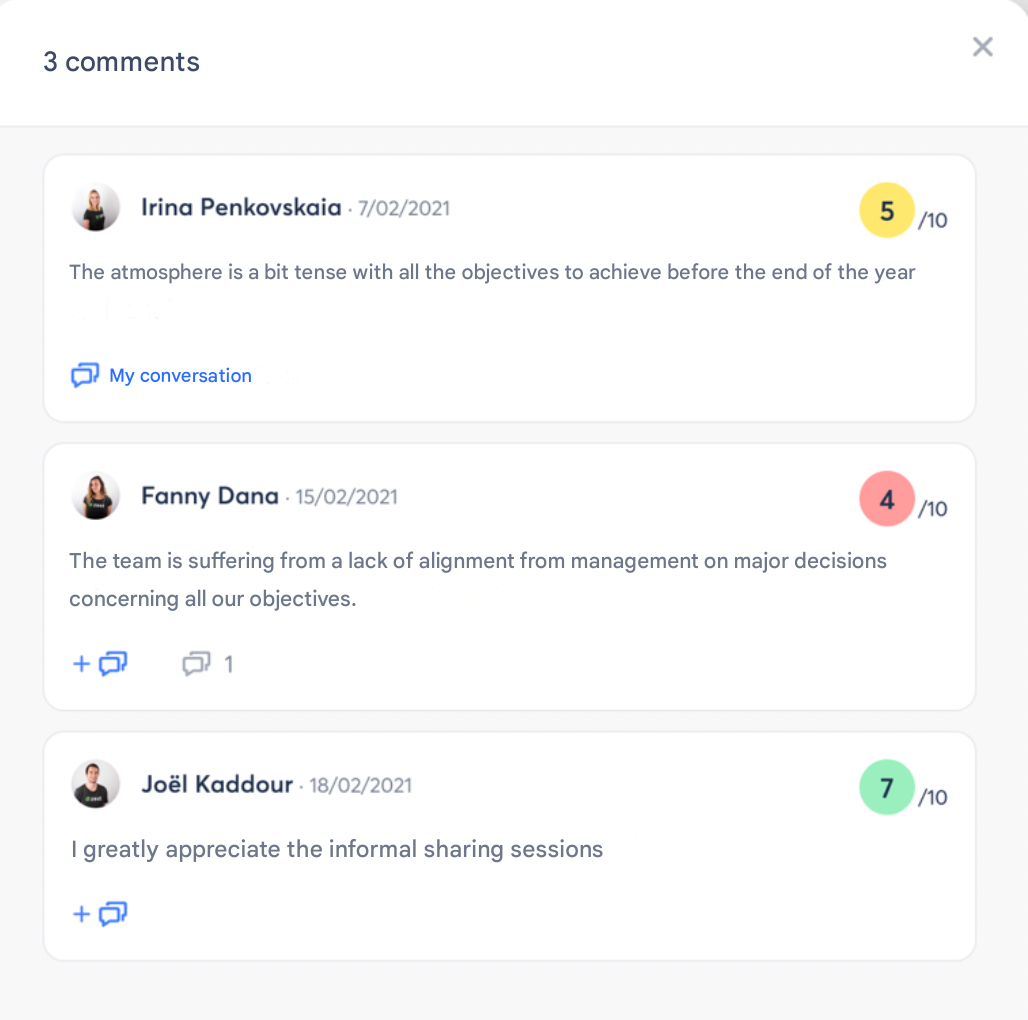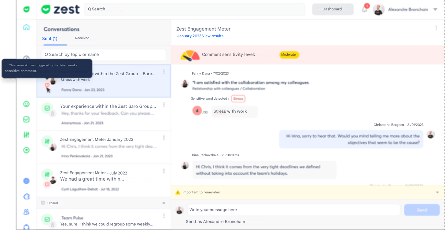 The Conversations feature allows managers and HR to communicate directly with an employee following a comment left in a Survey or an Engagement Survey, whether the response was Public or Anonymous (if enabled in the Back Office).