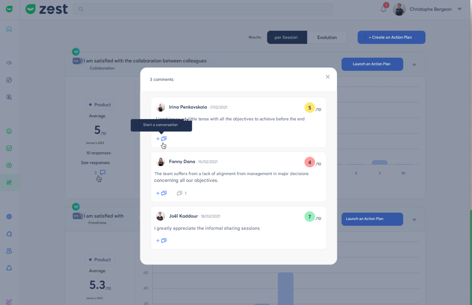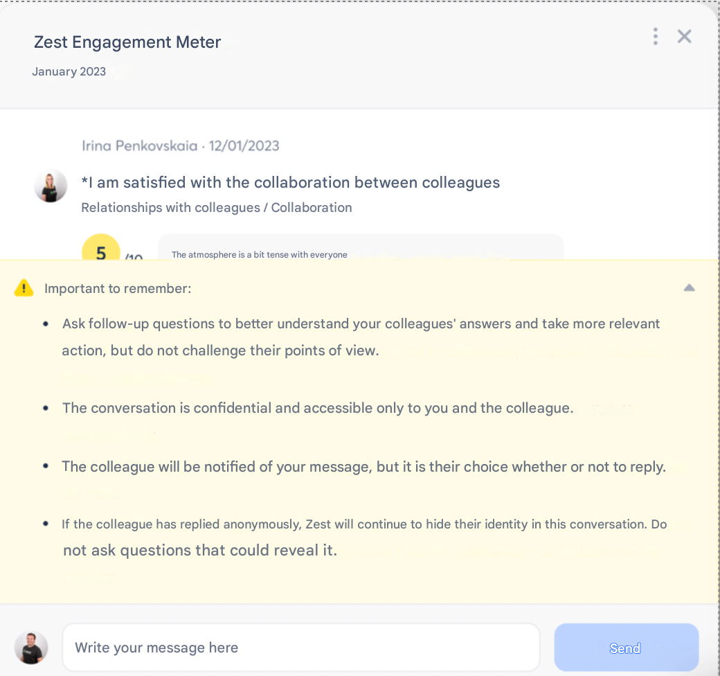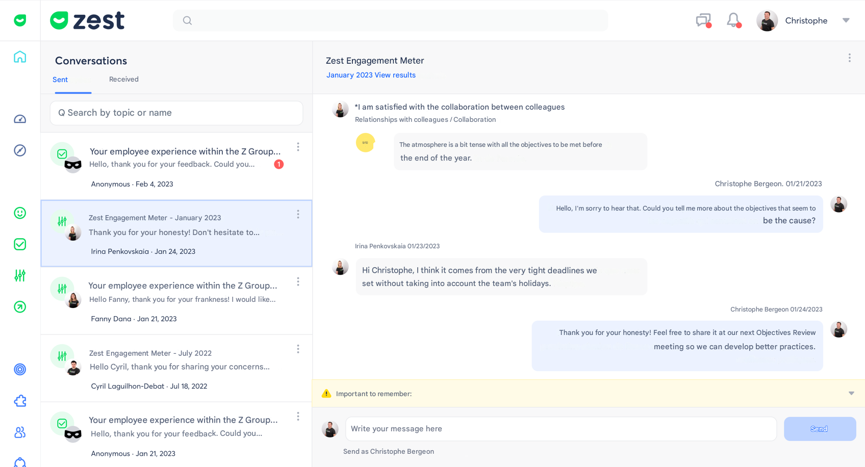 The Conversations feature allows managers and HR to communicate directly with an employee following a comment left in a Survey or an Engagement Survey, whether the response was Public or Anonymous (if enabled in the Back Office).