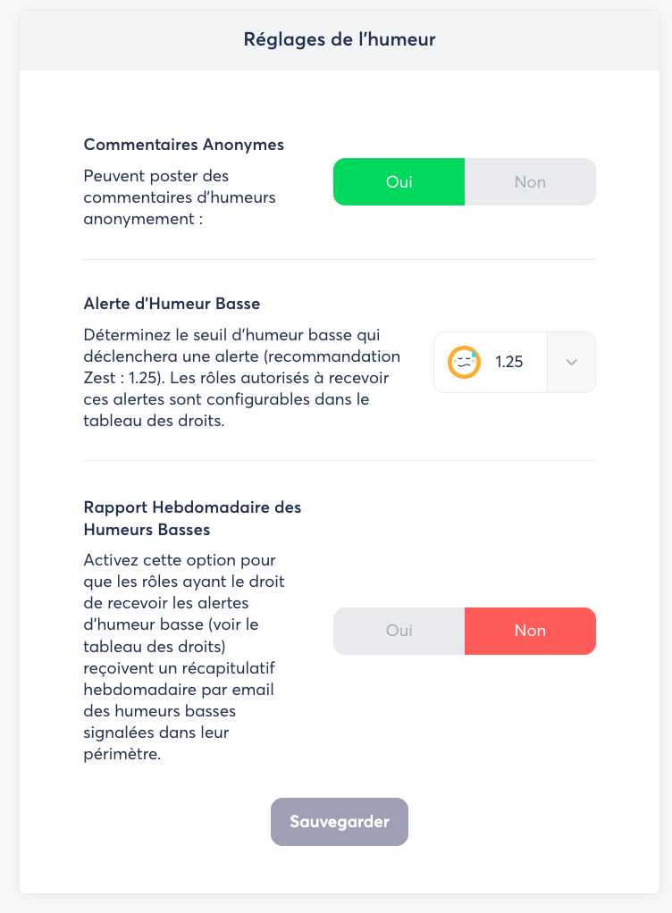 Before fully deploying the Mood feature in Zest, certain settings must be reviewed and configured in the Back Office, particularly SOS management, which is essential to ensure fast and secure handling of sensitive situations.