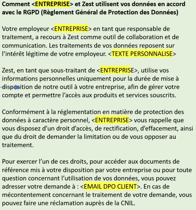 💬 This text will be displayed in the GDPR notice that each employee validates during their first login to Zest.