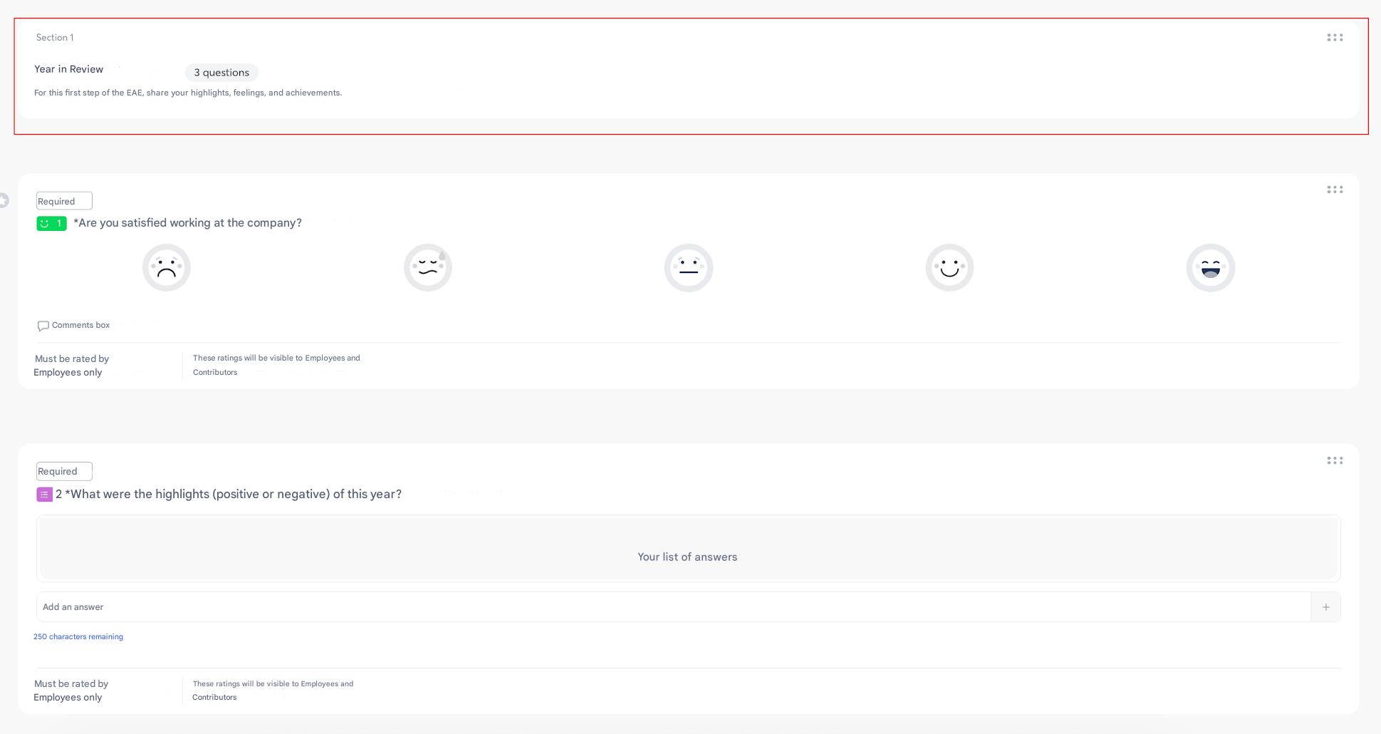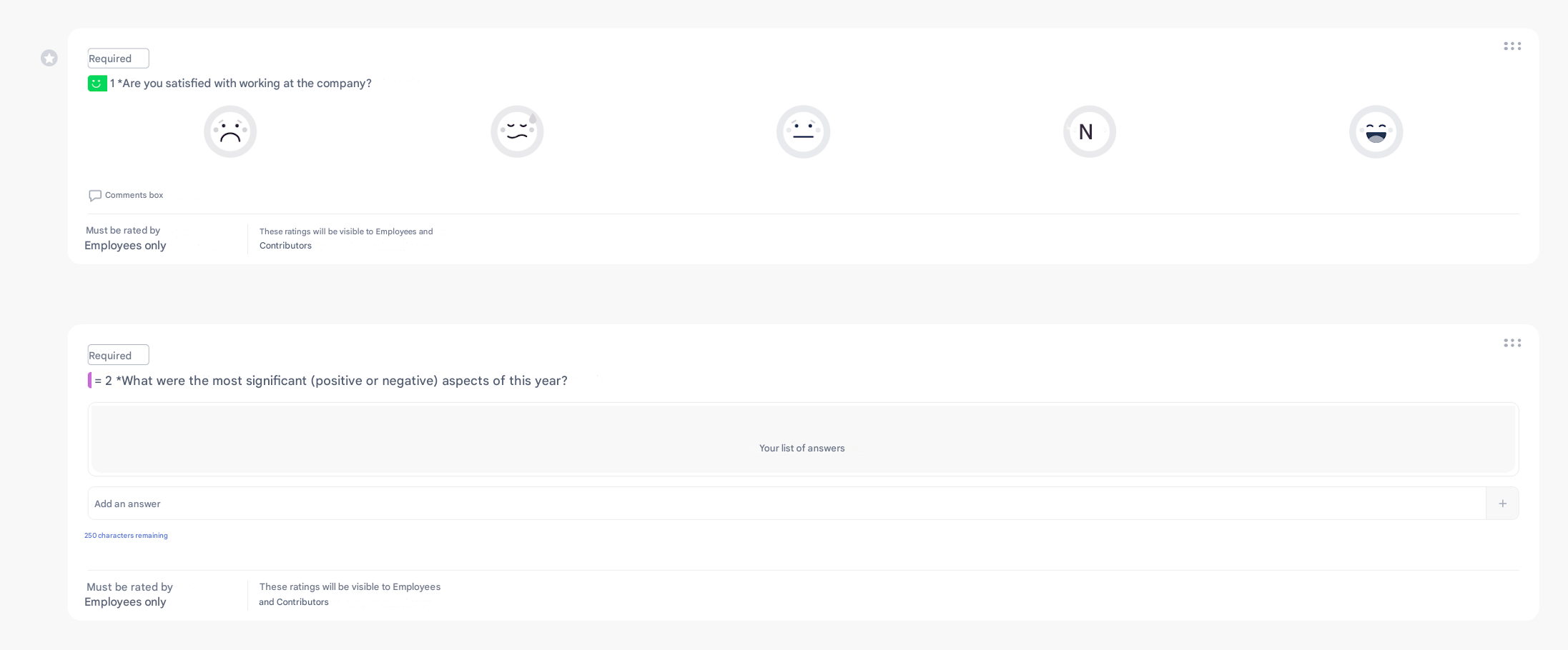 A question is the element to be completed by the employee or the contributor.