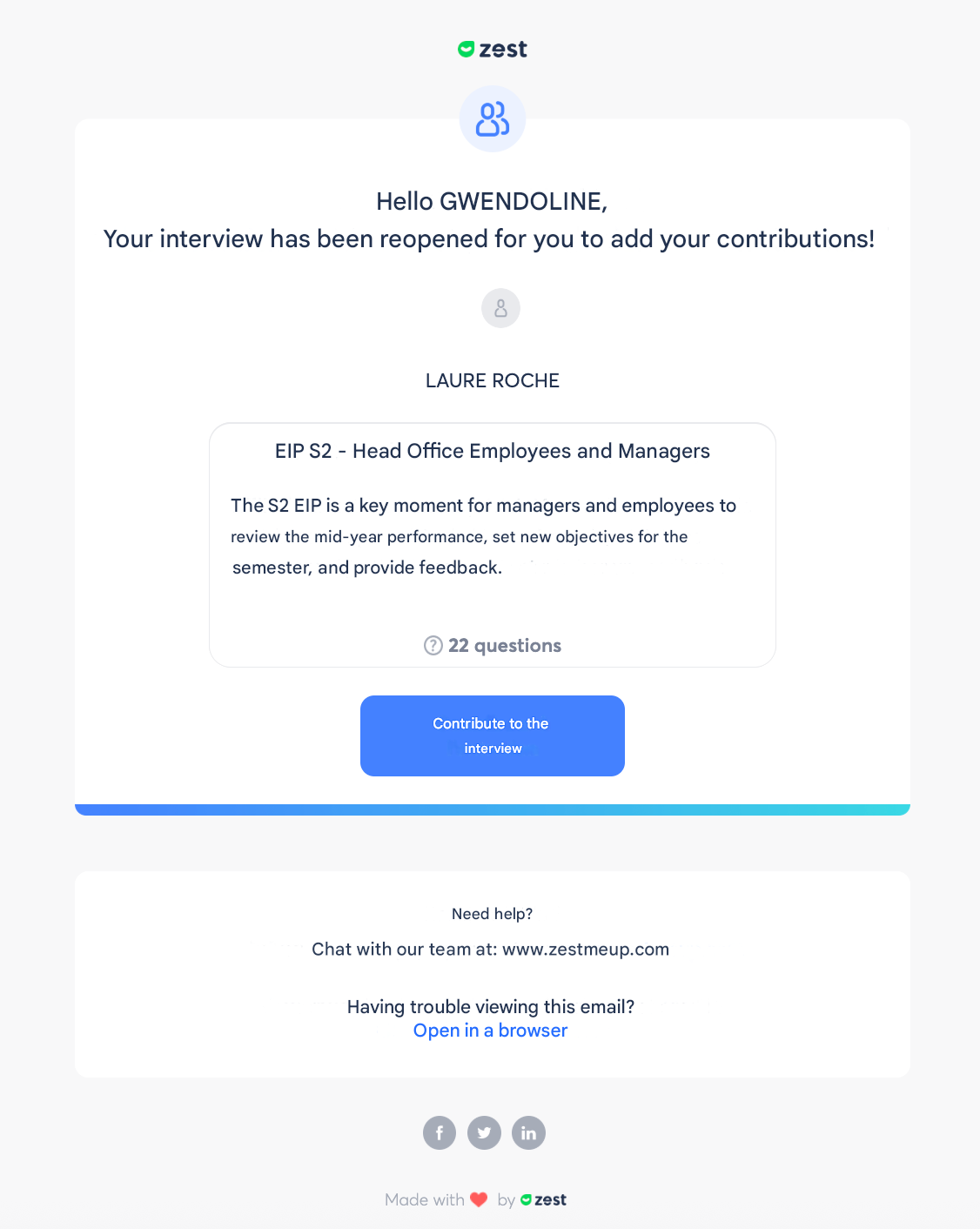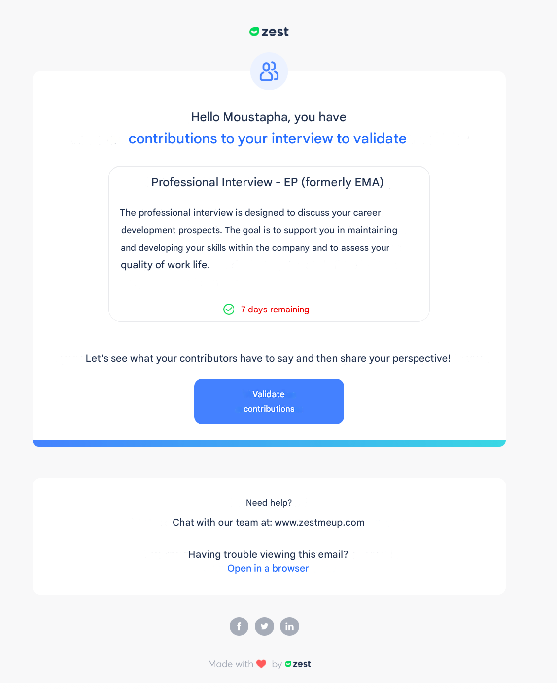 | 4 | When a new period begins (contribution, then validation if applicable) | The manager is invited to contribute to their employees’ reviews; the employee is invited to validate their review | Immediate email (if enabled) + app notification |