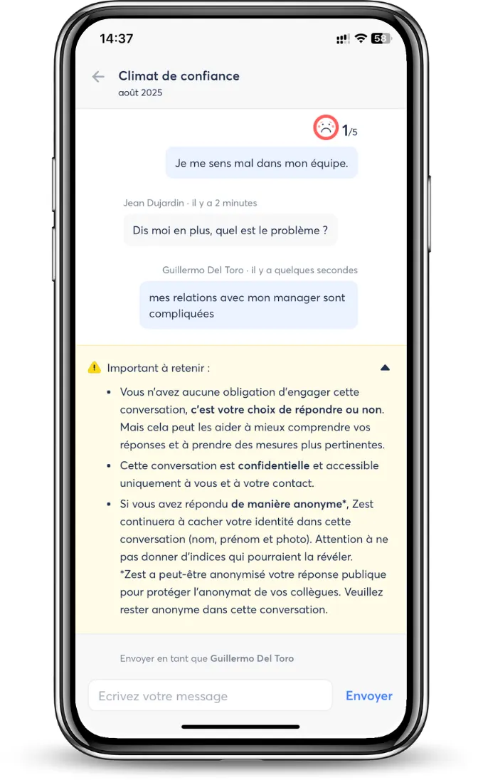 The Conversations feature allows a dialogue to be opened between an employee and their manager or HR, starting from a comment left in a survey. Until now, conversations had to be launched and continued exclusively on the web.