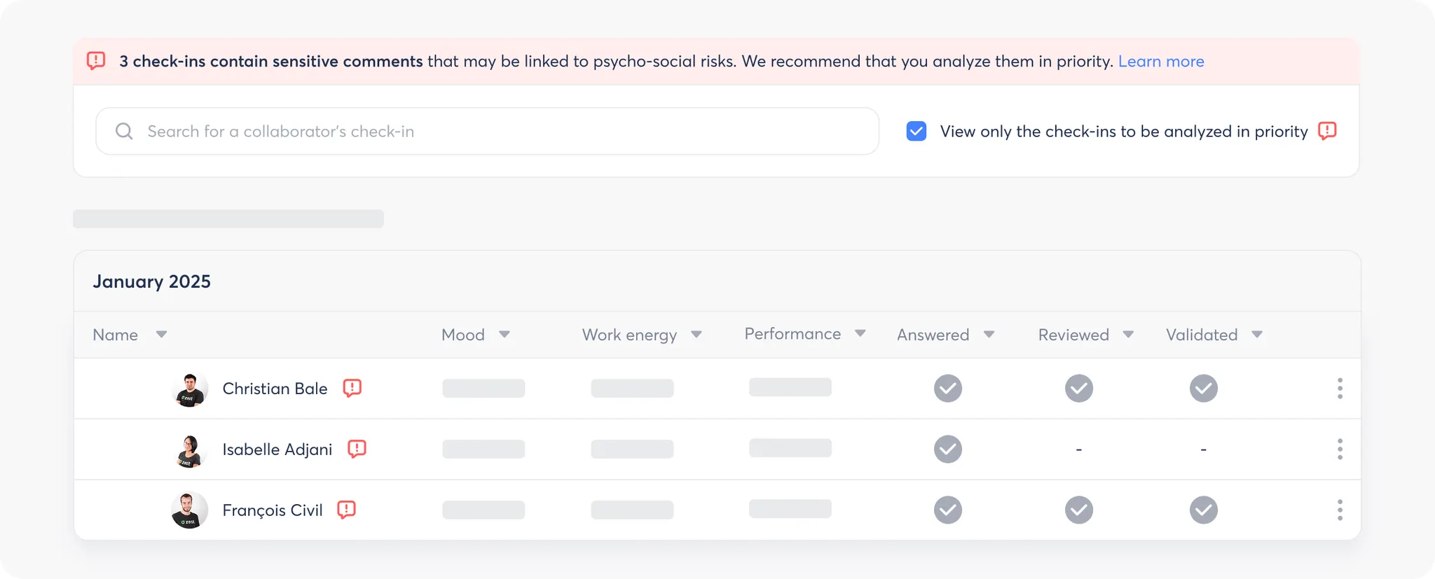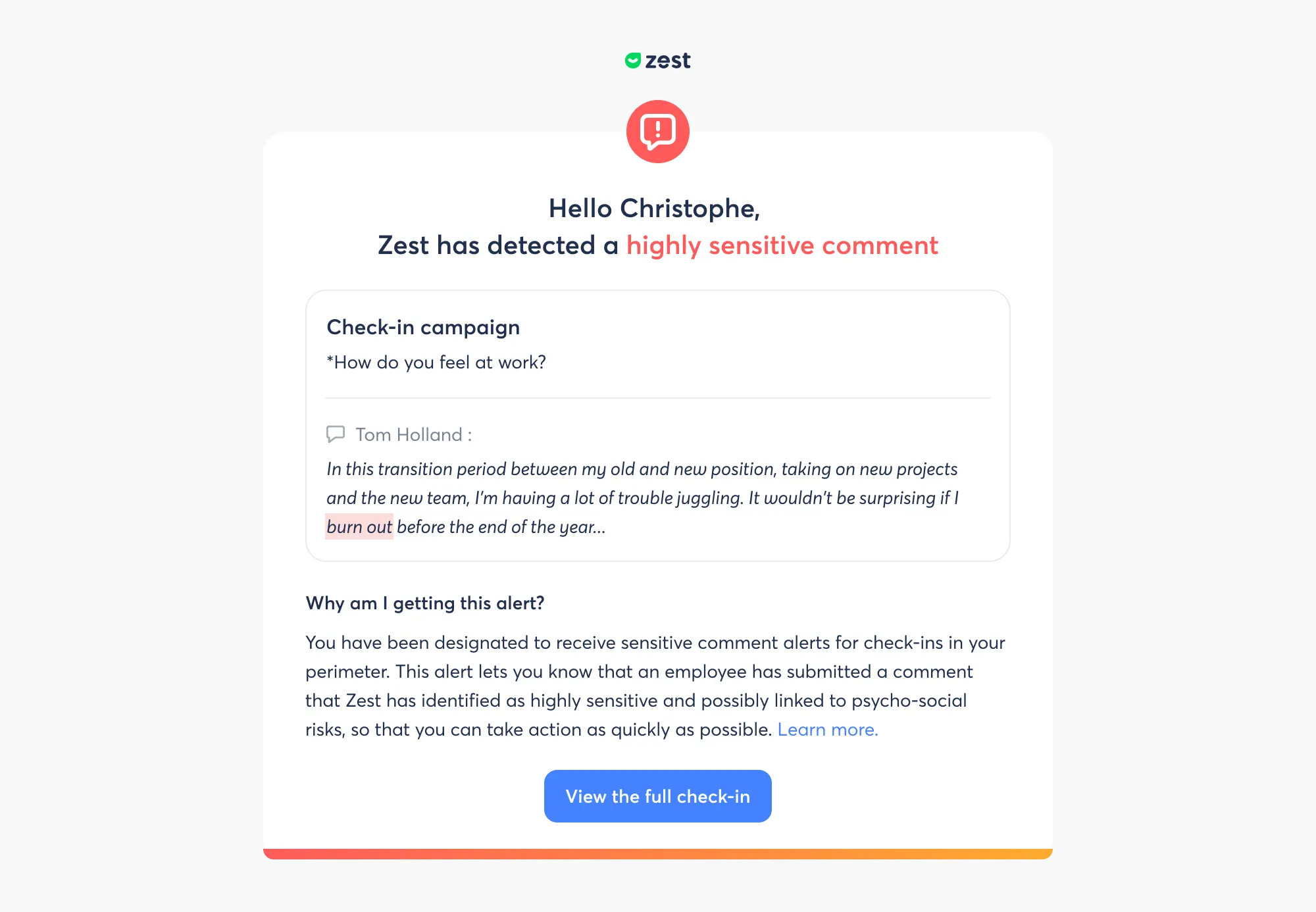 💫 Zest simplifies and speeds up the process of taking action by automatically alerting you when a sensitive comment (containing sensitive expressions such as harassment, burn-out,...) is detected in Check-ins.