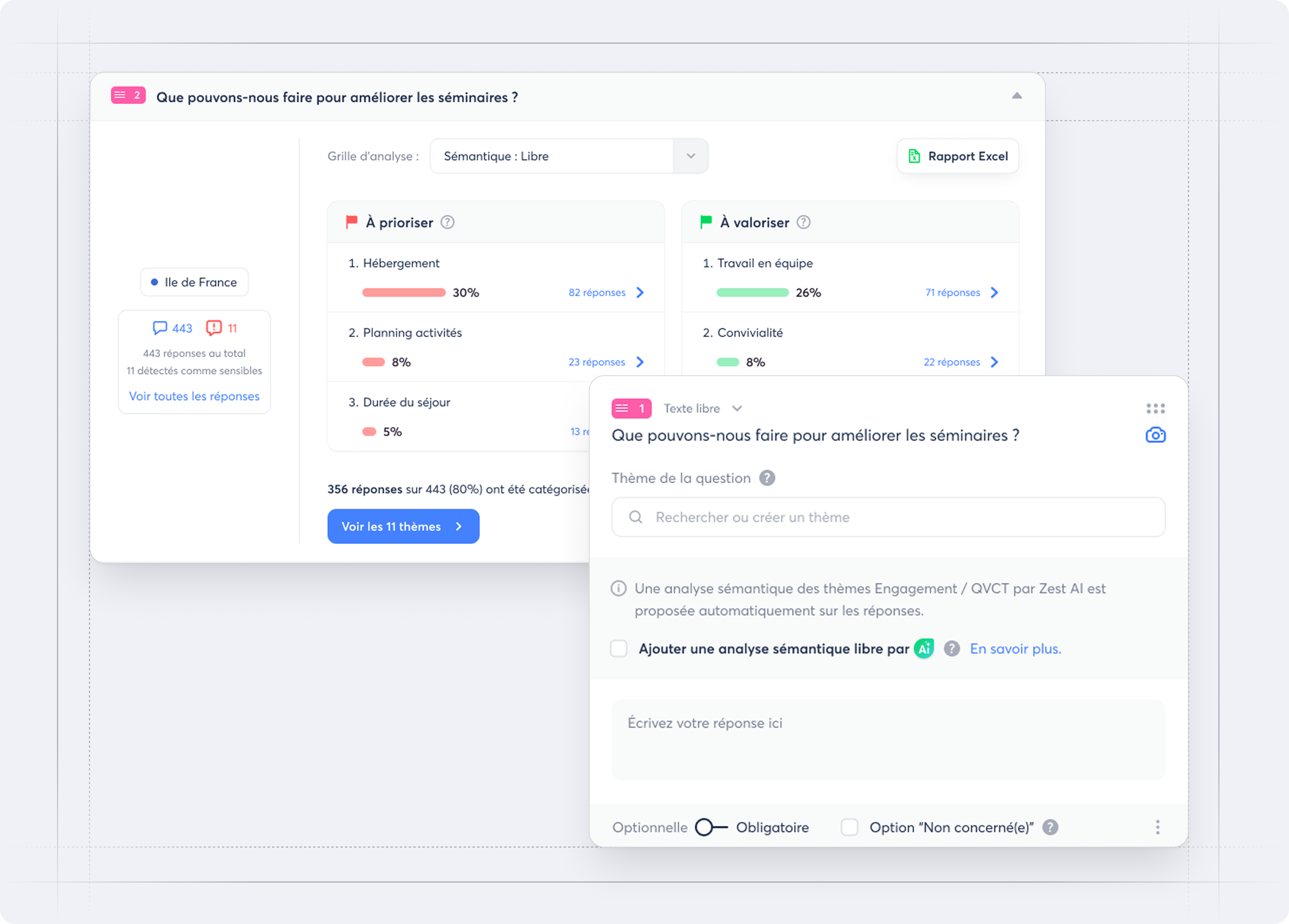 It centralizes the main metrics (participation, overall score, eNPS…), highlights key questions, and offers a simplified thematic view to quickly understand strengths and areas for improvement.