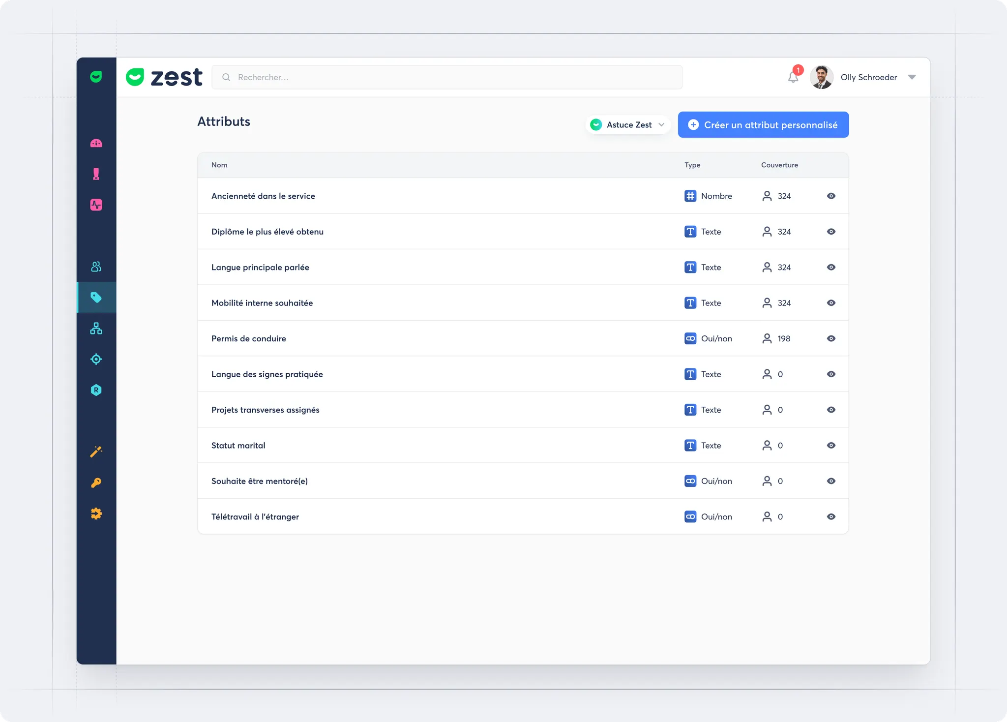 As a SuperAdmin, you now have access to a new dedicated section in the back office to independently create and edit custom attributes. These attributes help structure key information about your users and play a central role in many Zest features.