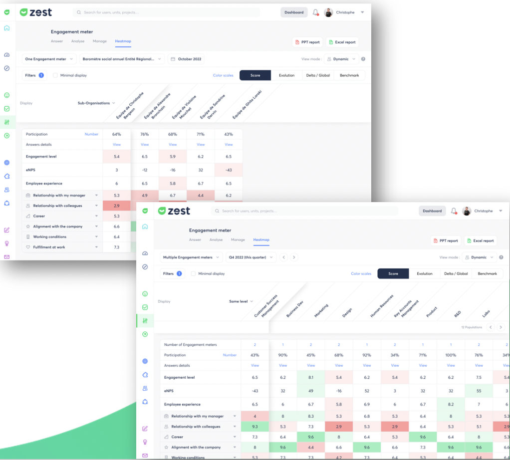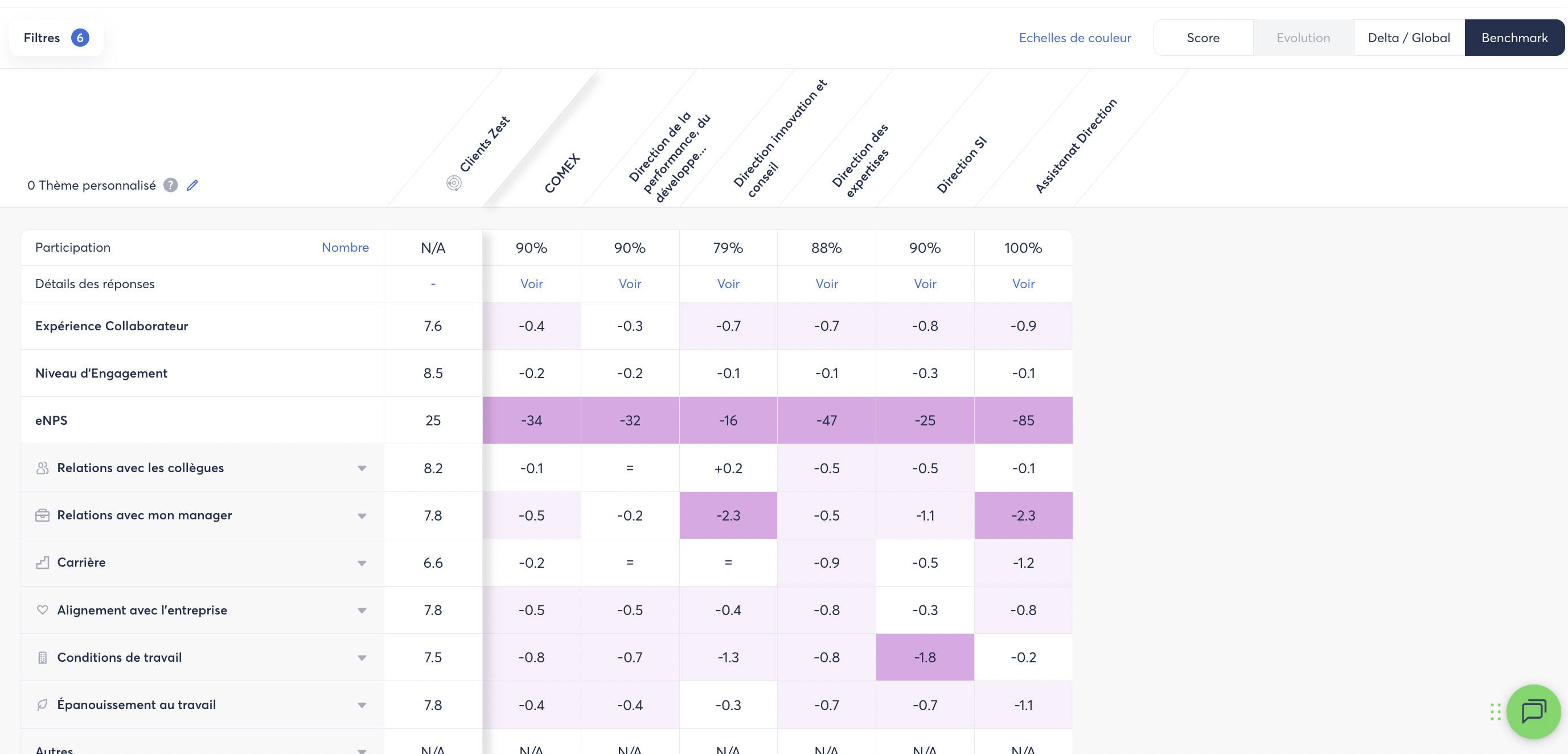 La Heatmap permet de comparer les scores Engageomètre entre différentes organisations, et de visualiser les résultats sous différents angles.
