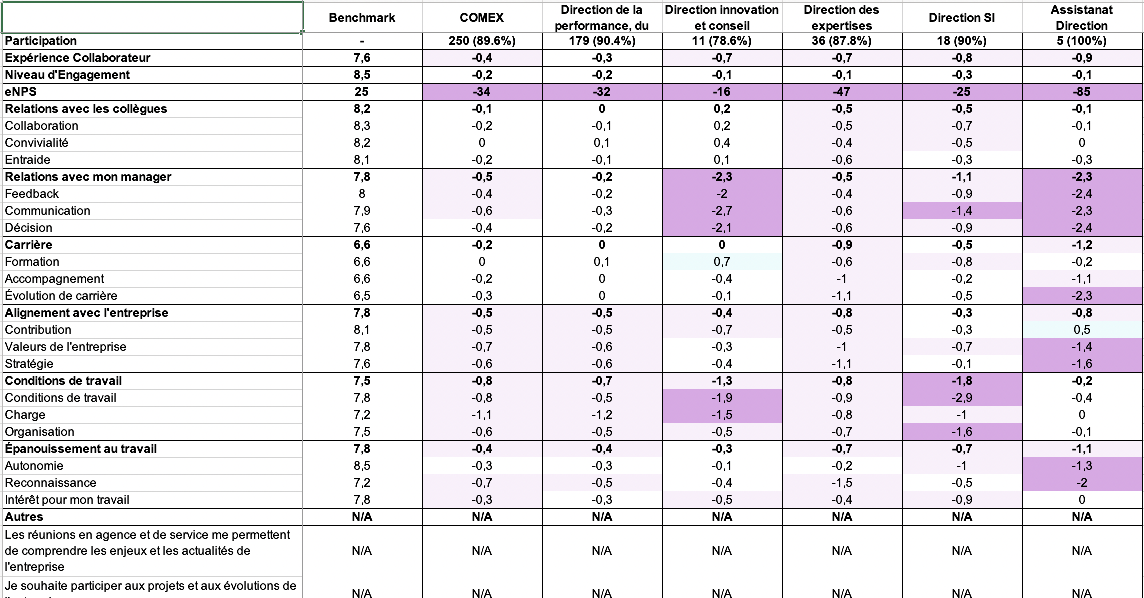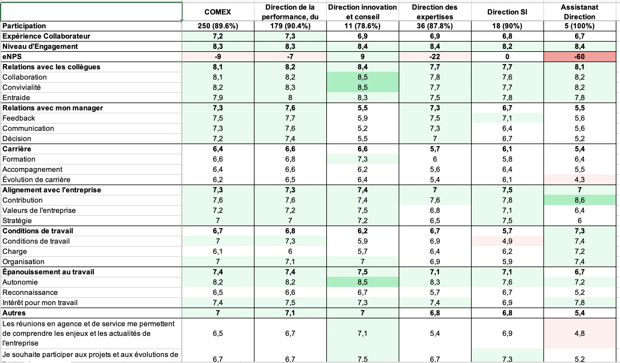 - Delta / Global : différences de scores et positions dans les quartiles par rapport aux scores médians de l’entreprise.