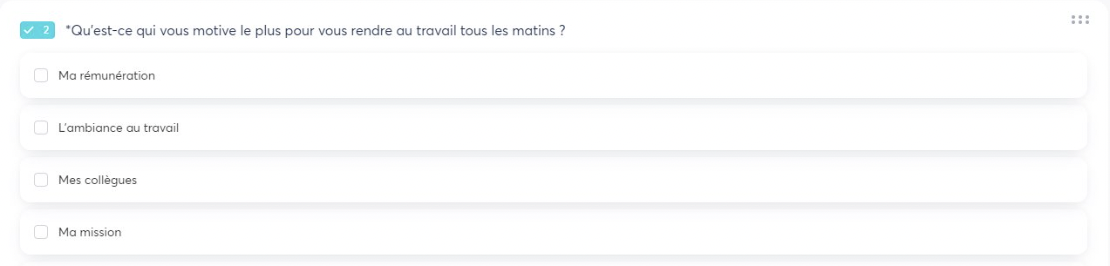 - Pour rendre une question optionnelle (donner la possibilité aux collaborateurs de passer à la question suivante sans donner une réponse) : cliquer sur les trois petits points en bas à droite et cliquez sur « rendre optionnel ».