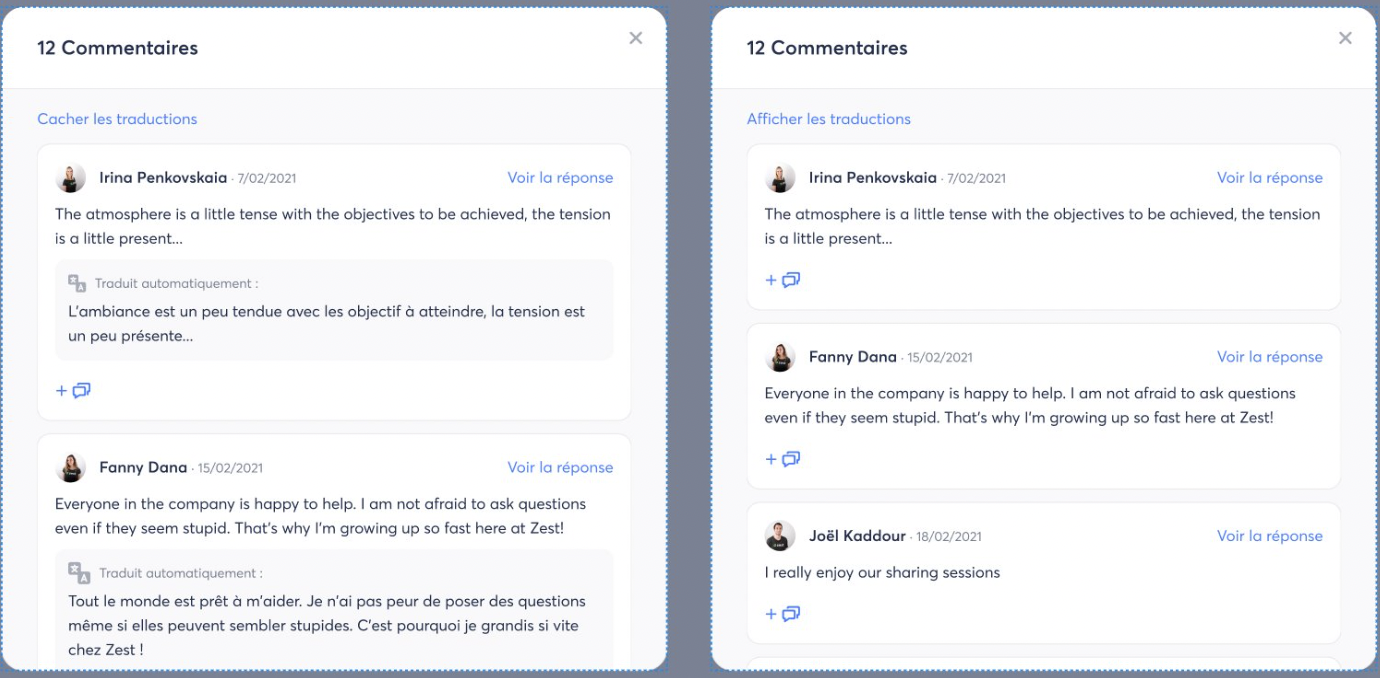 La fonctionnalité de traduction permet aux RH et managers (créateurs de sondages, Super Admins, managers) de consulter les verbatims dans leur langue d’usage, directement depuis la plateforme Zest.