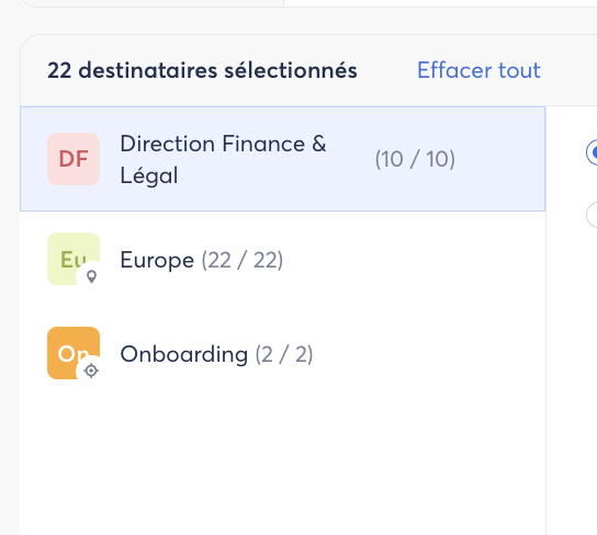 - Sélection de groupes dynamiques prédéfinis dans le back office (ex. : managers, CDI, nouveaux arrivants…).