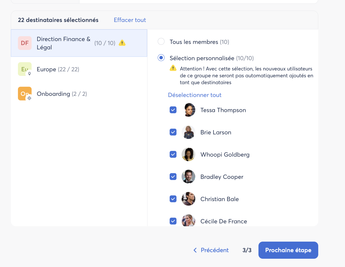 - Vous pourrez voir tous les collaborateurs concernés, et au besoin désélectionner certains profils.