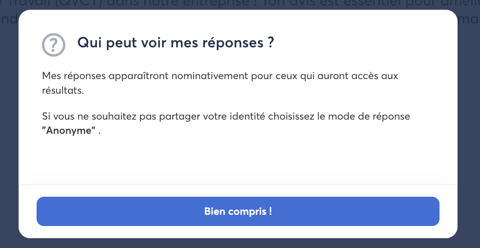 Zest applique un seuil d’anonymat (paramétré par défaut à 3) pour garantir la confidentialité des réponses anonymes. Ce seuil est une condition de visibilité des résultats.