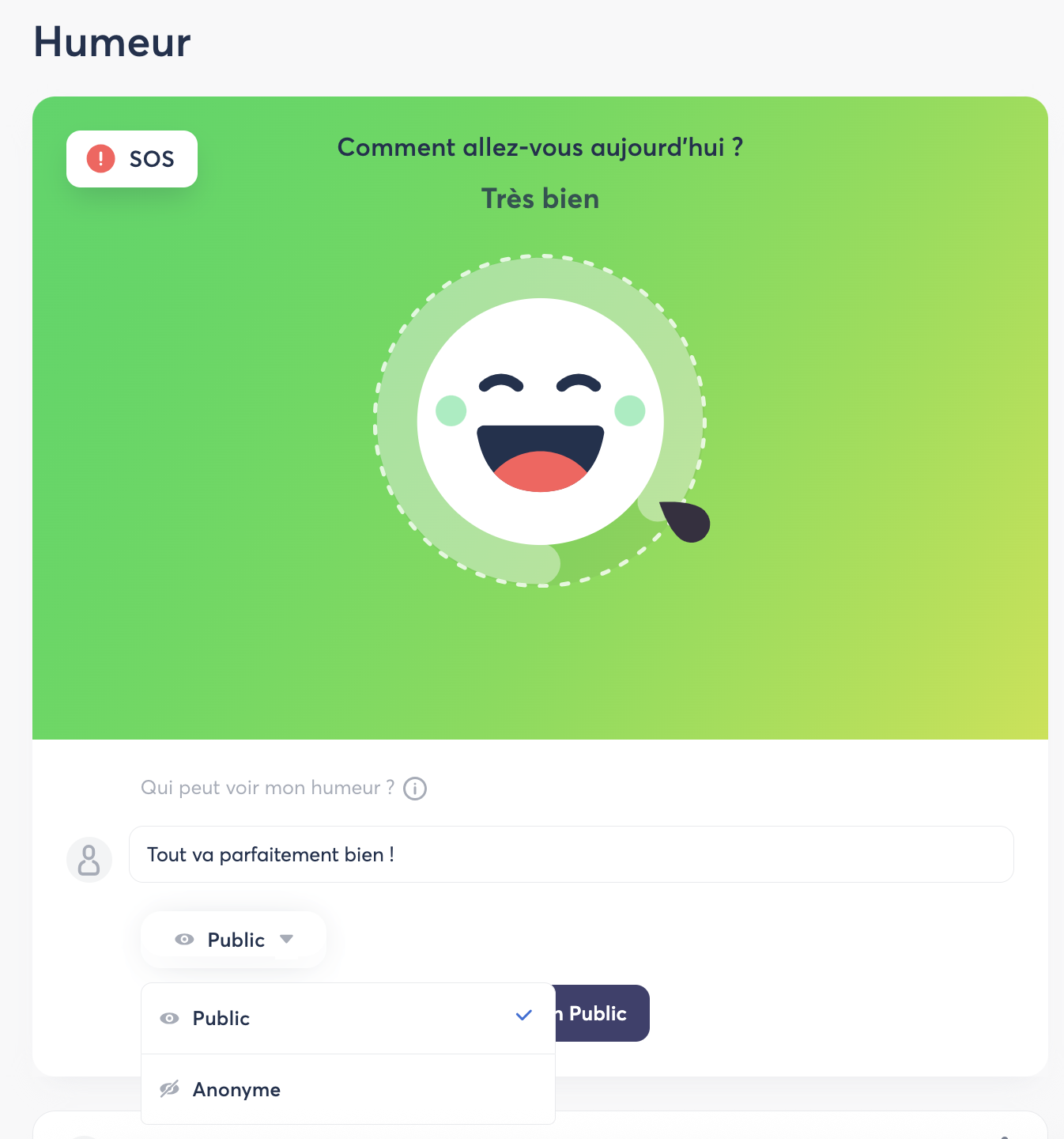 En tant qu’utilisateur, je souhaite mettre à jour mon humeur. Il me suffit de me rendre dans l’onglet Humeur sur le bandeau bleu de gauche