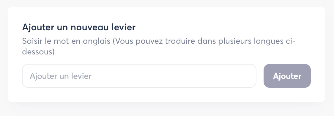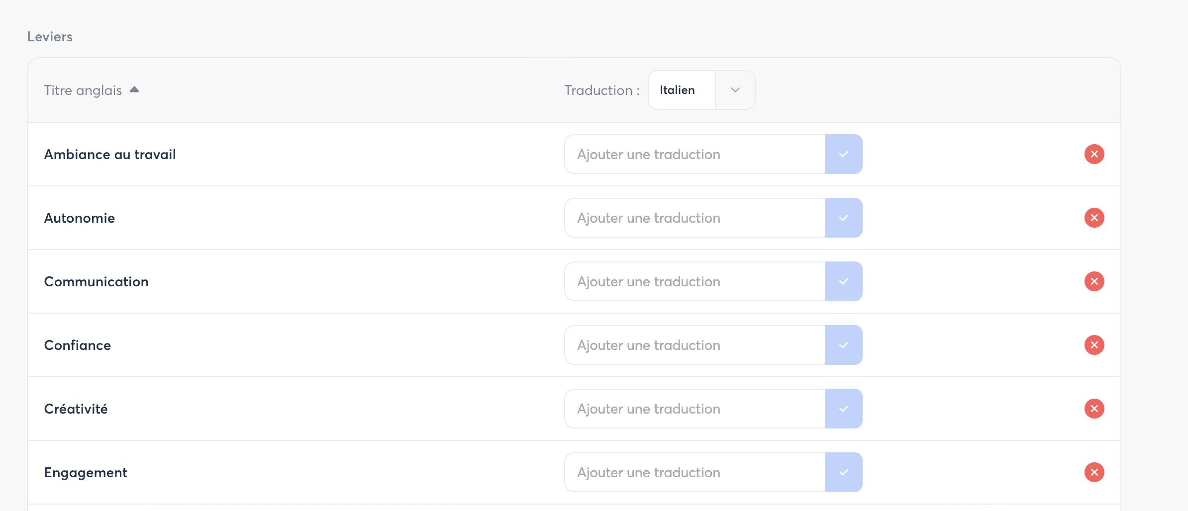 Depuis cette page, vous allez pouvoir consulter les leviers pré configuré sur Zest. Il est possible de les traduire dans différentes langues :