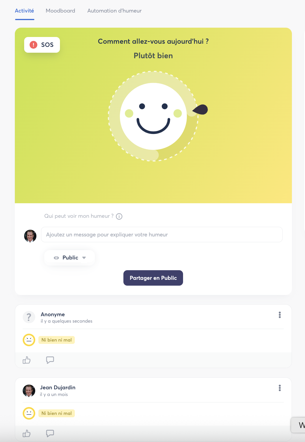 L’humeur publique : Les salariés peuvent voir quel est l’utilisateur qui indique son humeur avec son commentaire s’il en a laissé.
