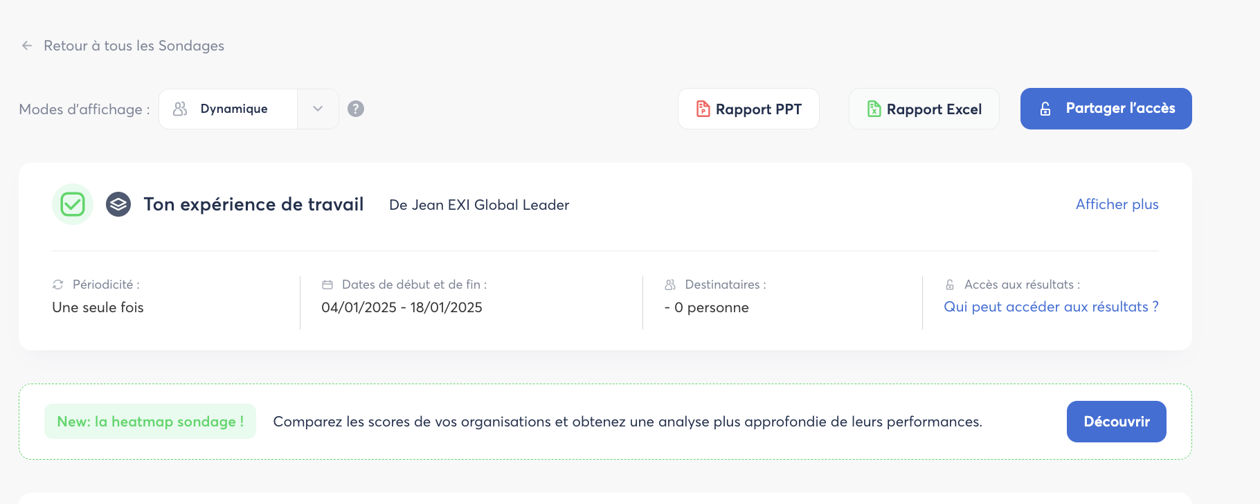 Zest vous permet d’exporter les résultats de vos sondages pour les analyser ou les partager plus facilement. Plusieurs formats sont disponibles : Excel, PowerPoint et commentaires sensibles.