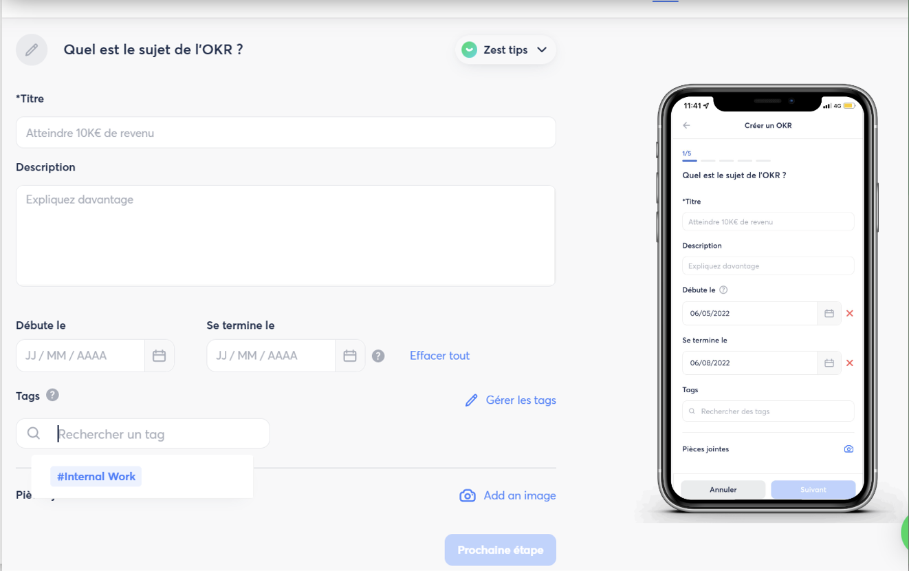 - Si OKR actif : les tâches deviennent des Key Results