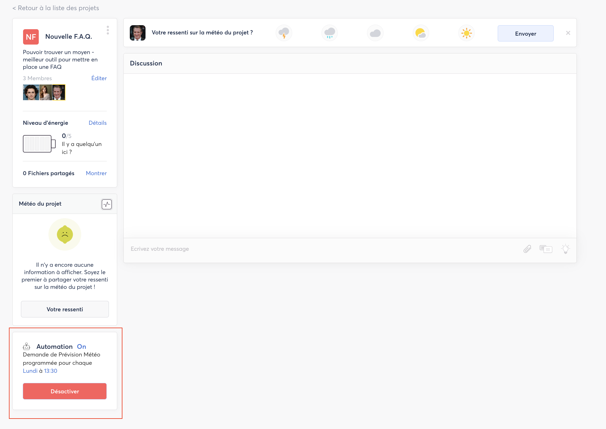 - Tous les membres du projet recevront automatiquement une demande pour partager leur humeur selon la fréquence choisie.