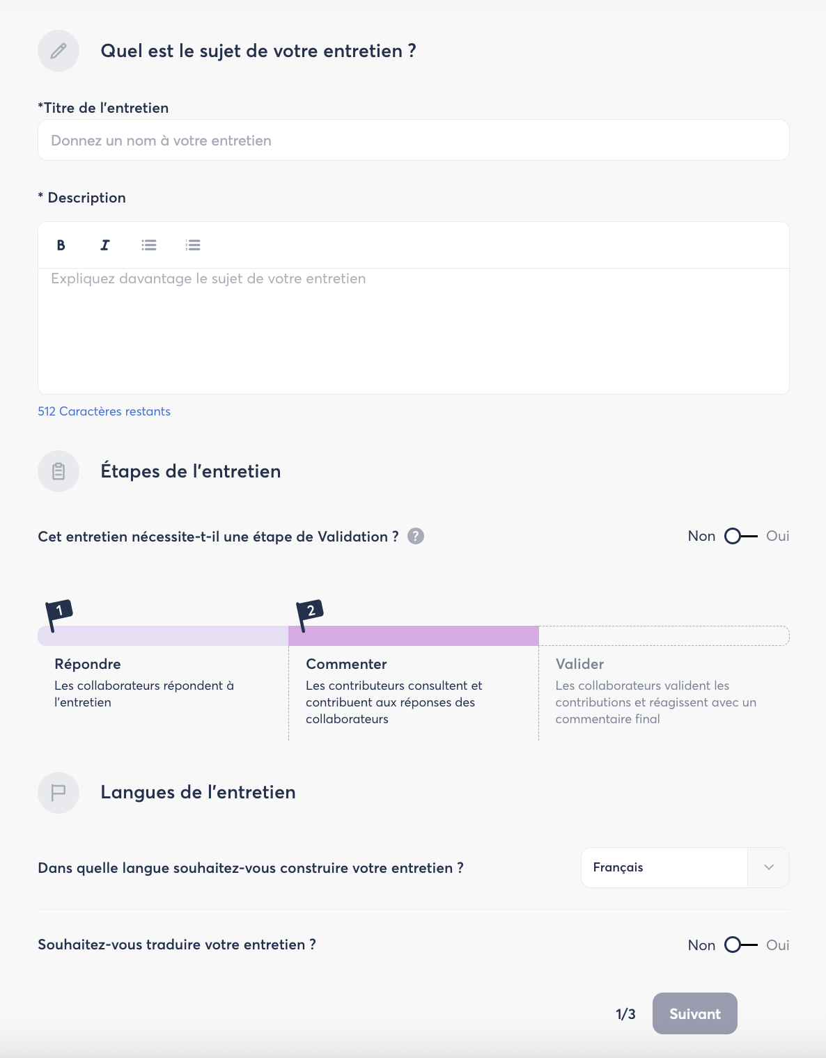 Les Super Admins et les Admins peuvent créer et lancer un entretien.