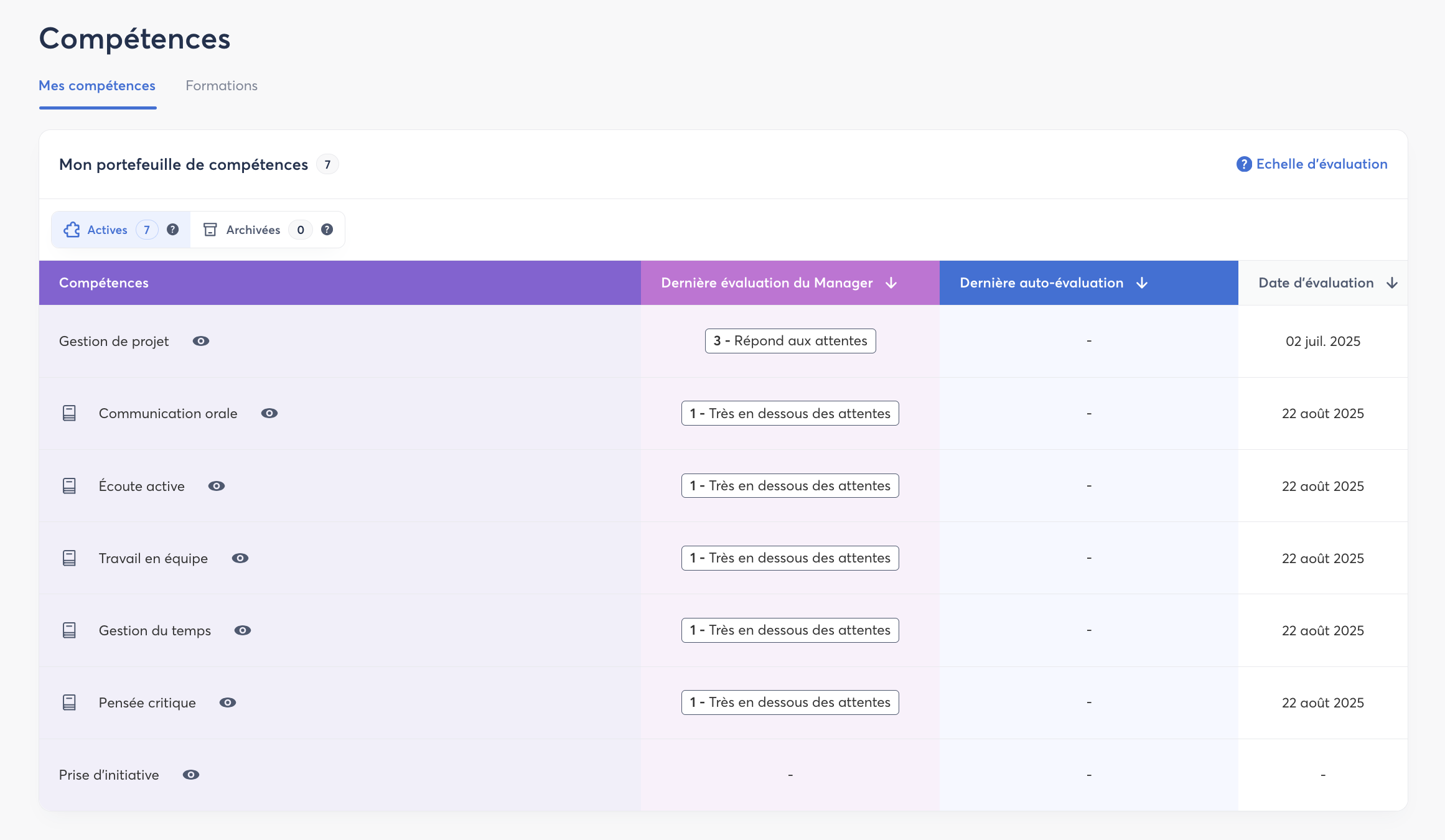 Chaque collaborateur dispose d’un portefeuille de compétences accessible depuis la fonctionnalité Compétences.