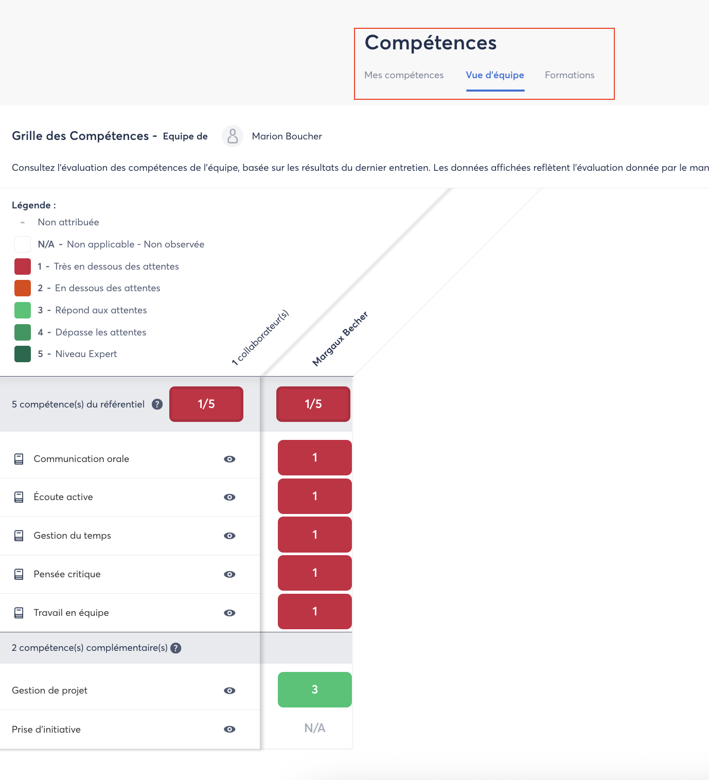 - Les managers et contributeurs, selon leur périmètre de visibilité, peuvent consulter le portefeuille de compétences de leurs collaborateurs directs et indirects.