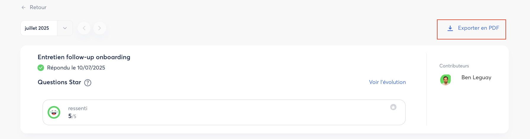 📄 Comment exporter/imprimer mon entretien ?Ouvrez votre entretien.Cliquez sur le bouton « Exporter en PDF ».Le fichier est alors téléchargé sur votre ordinateur.