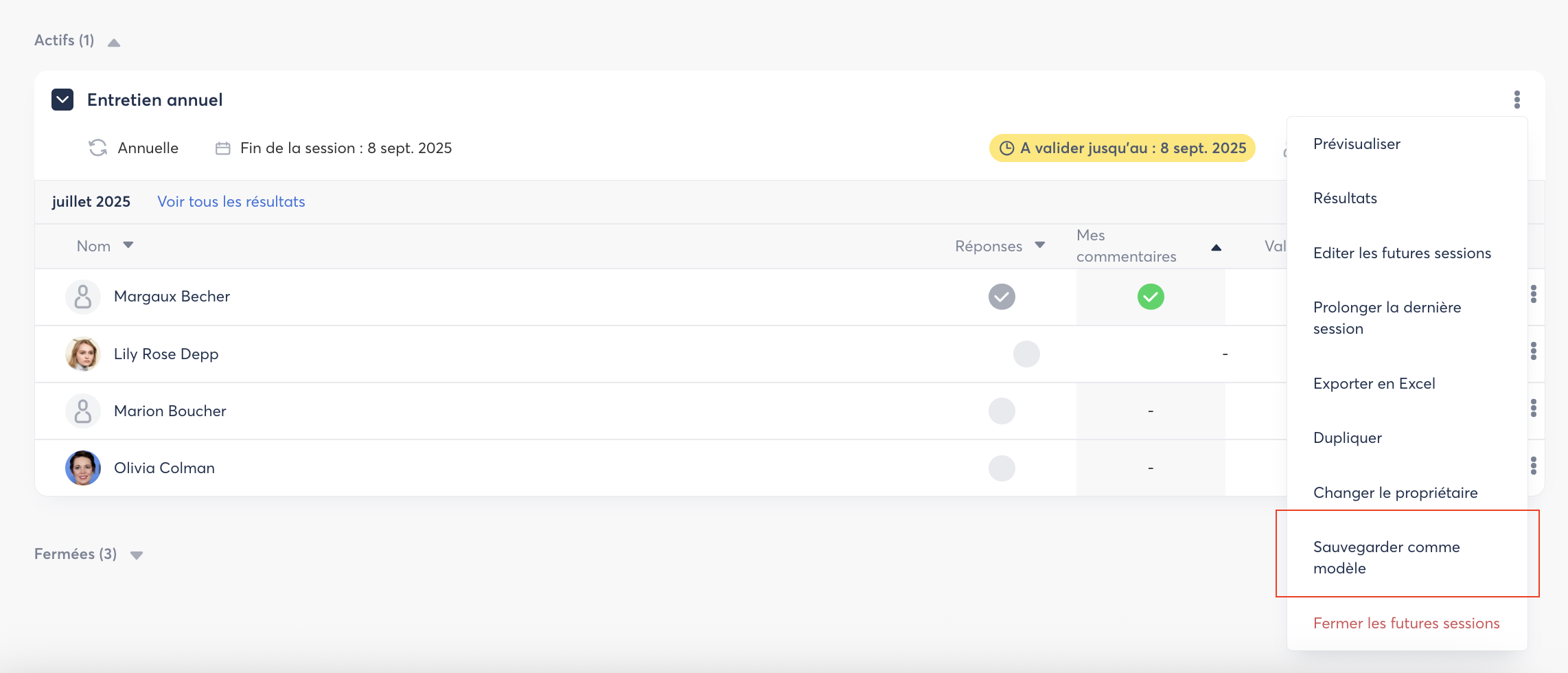 La fonctionnalité « Sauvegarder comme modèle » vous permet de réutiliser facilement la structure d’un entretien (questions, options, configuration) pour en créer de nouveaux.