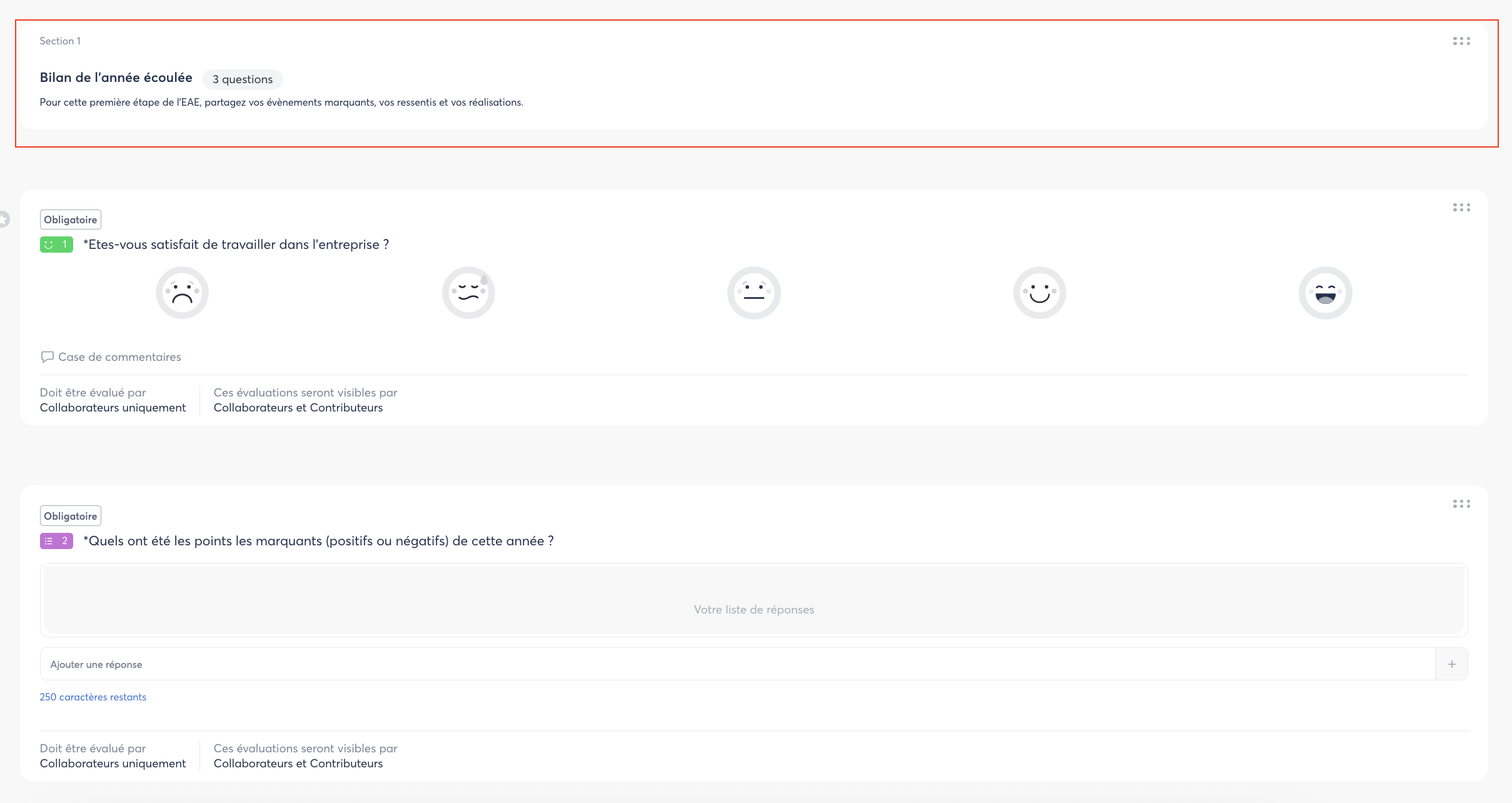 Une section permet de structurer un entretien en chapitres (ex. : Objectifs, Compétences, Feedback).