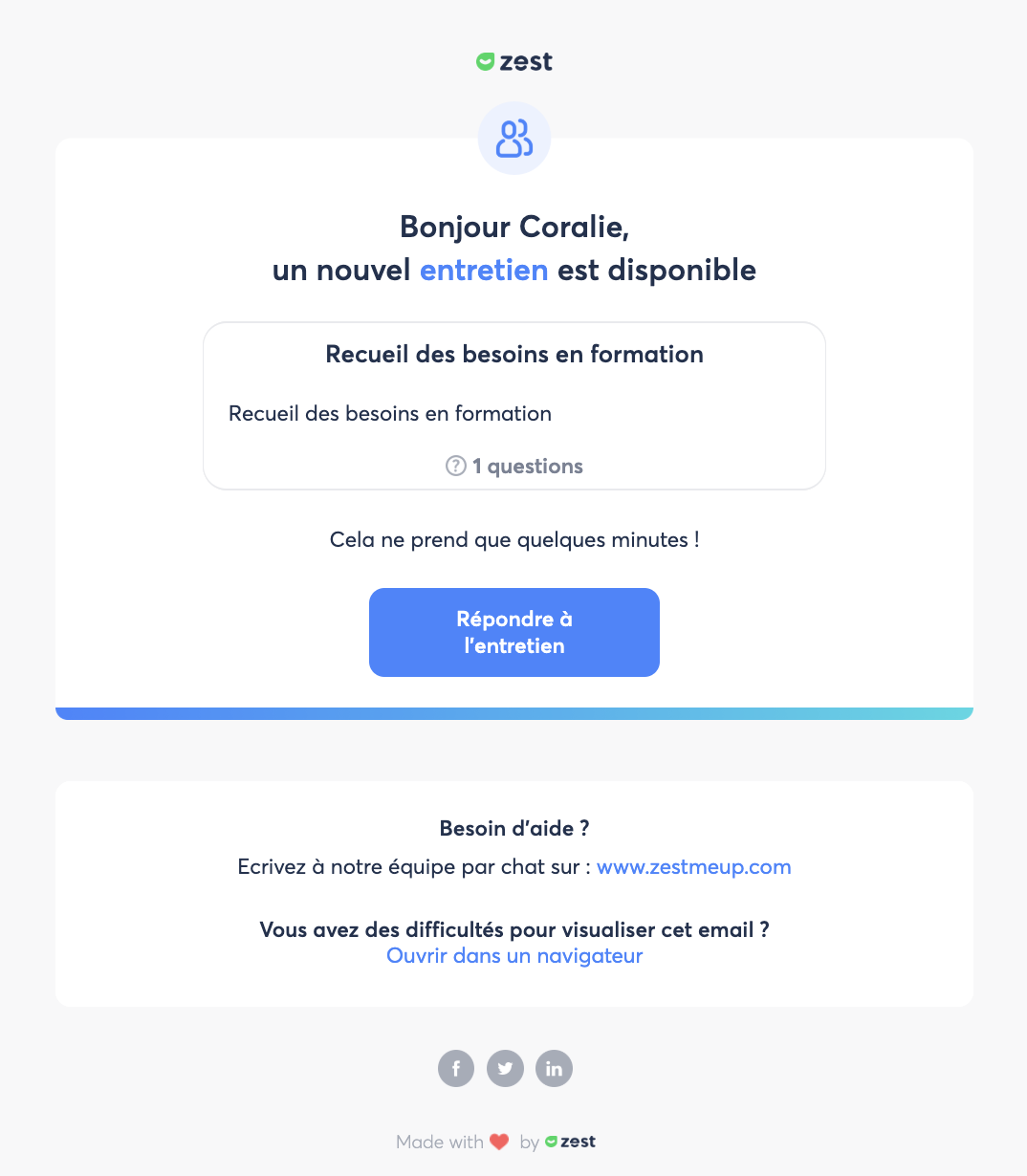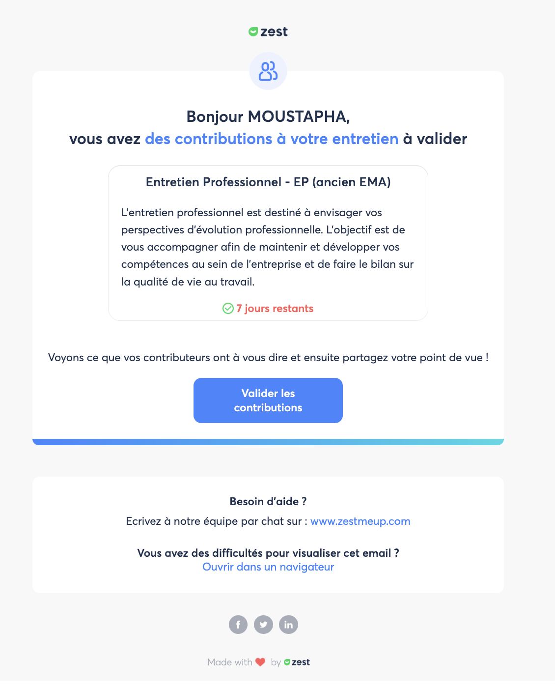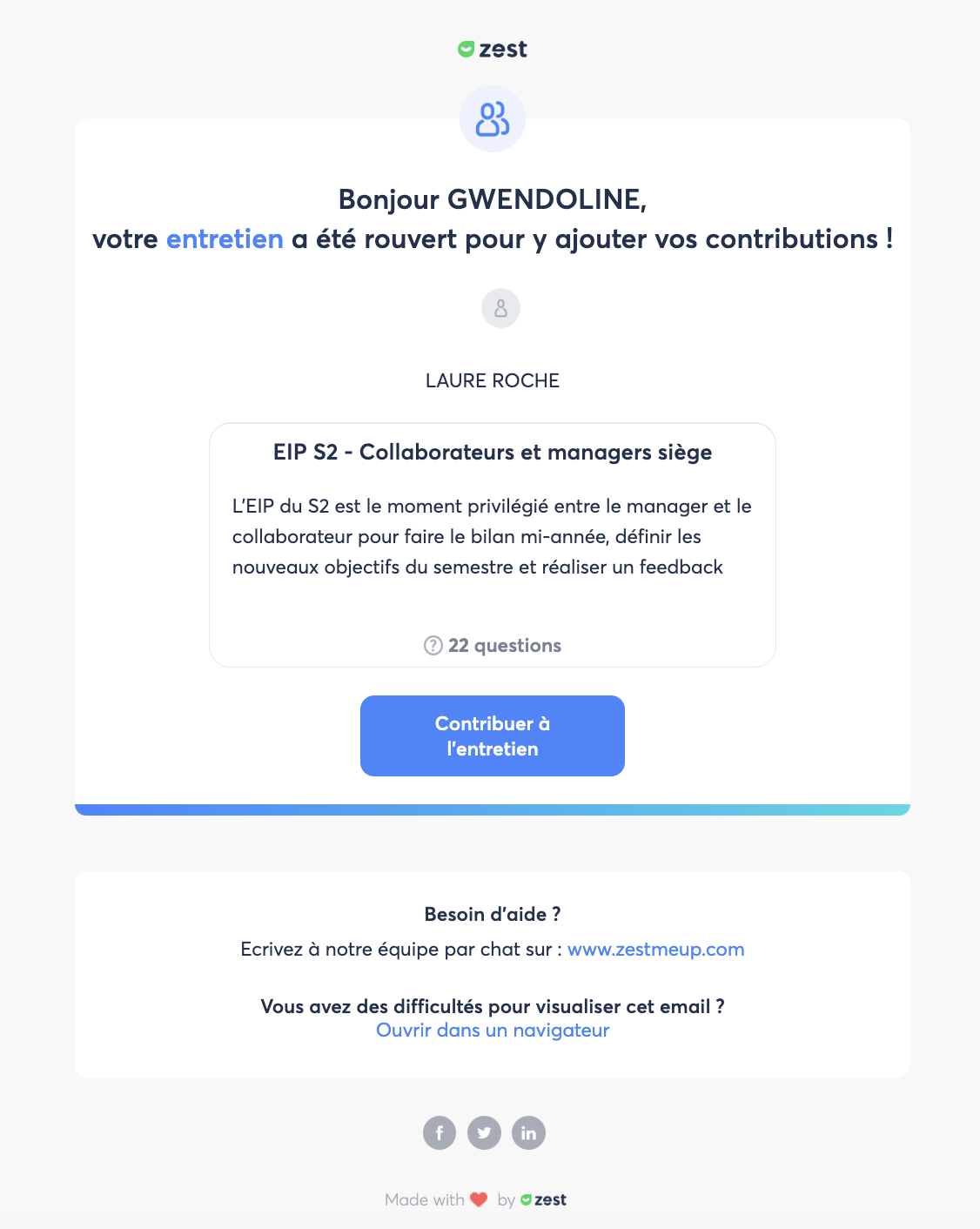 | 2 | Lorsqu’un collaborateur a répondu à son entretien | Le manager est invité à contribuer au point de son collaborateur | Email récap J+1 à 11h30 (si email) + notification app |