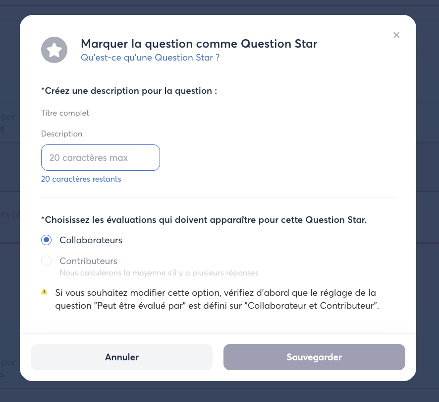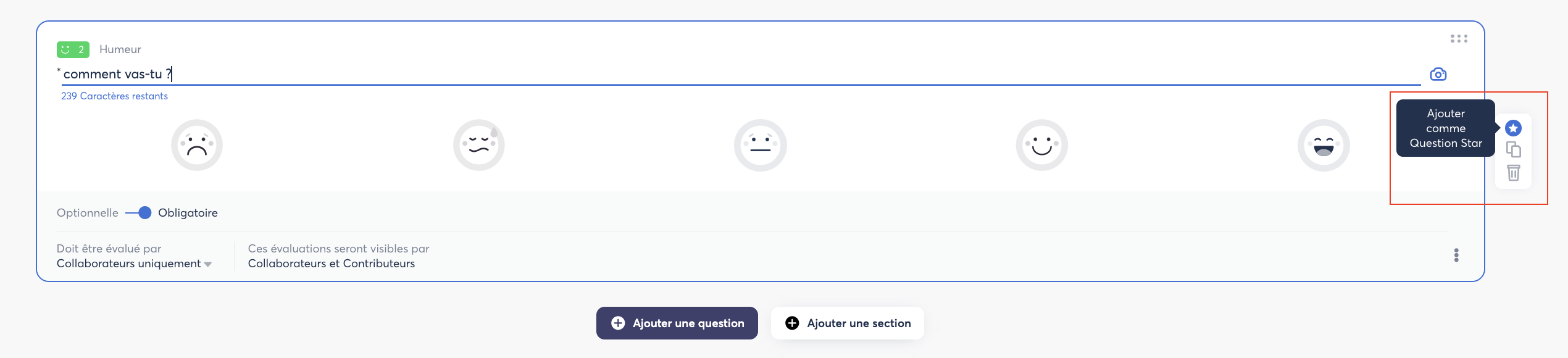 ⇒ Vous pouvez marquer 3 questions comme Question Star par entretien parmi les questions humeur, météo, curseur, évaluation et échelle.