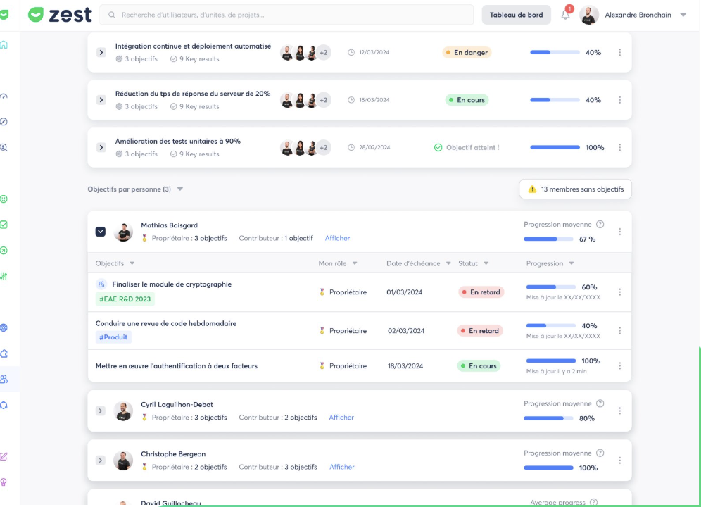 | Objectif en danger / en retard | Propriétaire | Email immédiat + notification app |