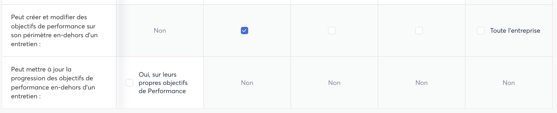 | OBJECTIFS | CREATION – Créer un objectif de Performance depuis le listing « Objectifs » | Contributeur | ❌ | ✅ |