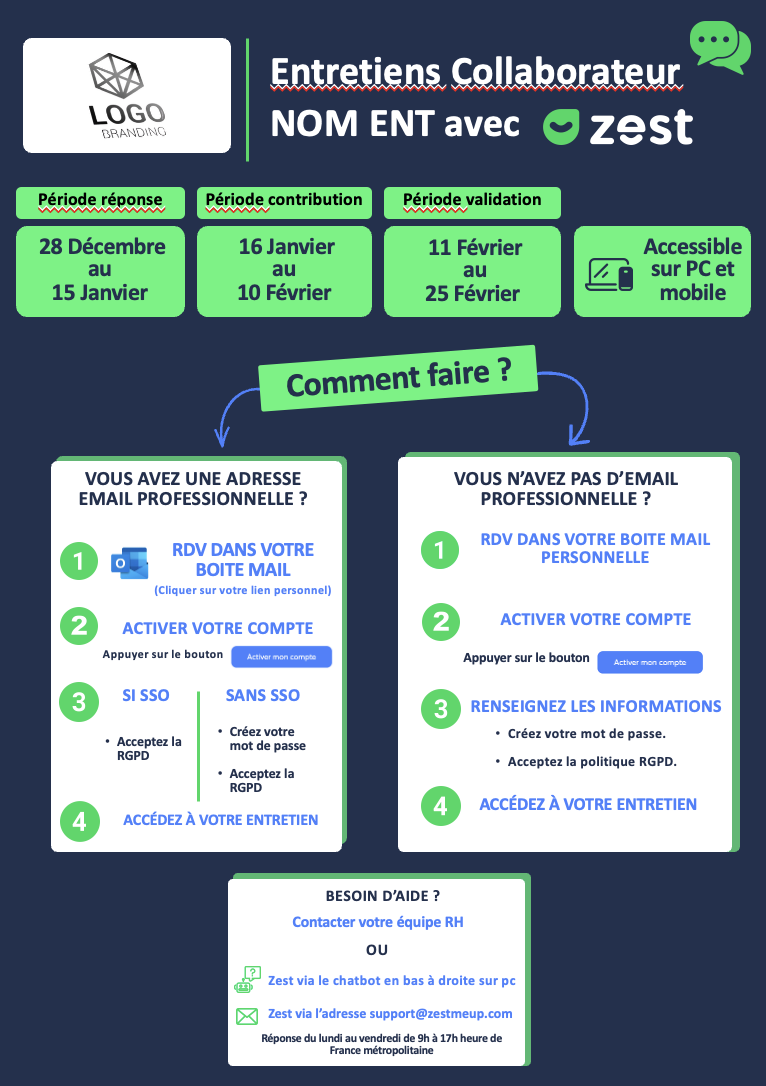 Les affiches de connexion Zest sont fournies au format PowerPoint, afin d’être entièrement personnalisables par vos équipes RH.