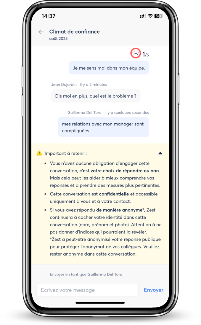 - La conversation est déclenchée depuis le web par un manager ou RH, à partir d’un commentaire laissé dans un sondage