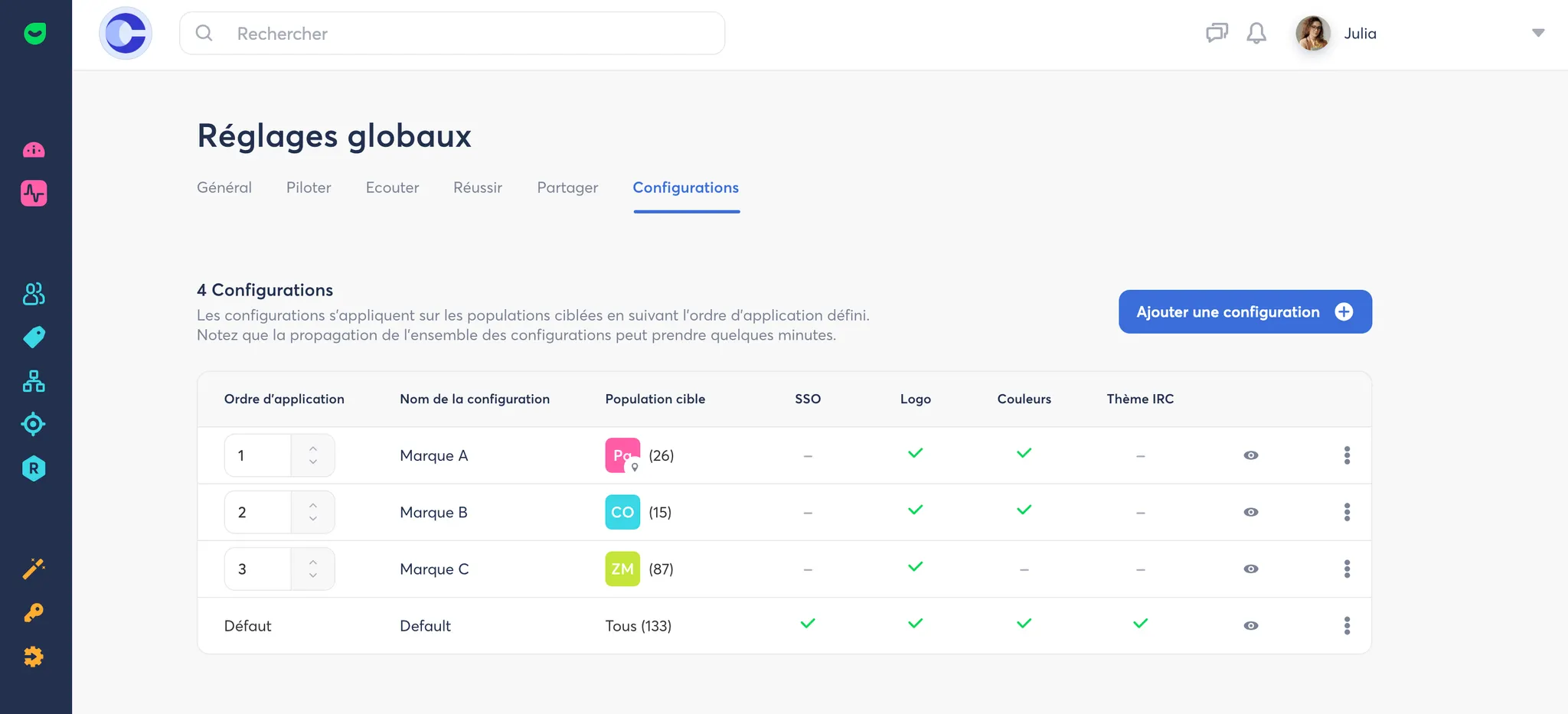 La gestion des configurations d’entités permet de personnaliser l’interface et les paramètres de connexion (logo, couleurs, thème de sondages conversationnel, SSO) pour des groupes spécifiques, simplifiant ainsi le déploiement à grande échelle et offrant une expérience adaptée à chaque entité.