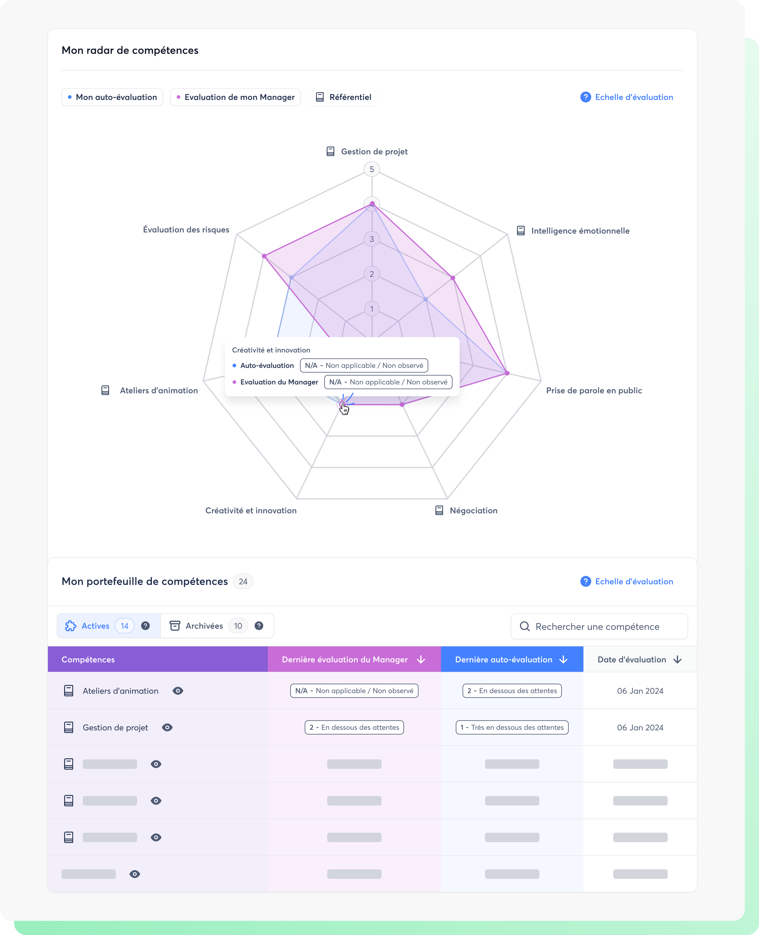 - Radar de compétences : Visualisez les forces et axes d’amélioration de vos équipes grâce à un graphique clair et interactif. Comparez les auto-évaluations et celles des managers pour des analyses engageantes et constructives.