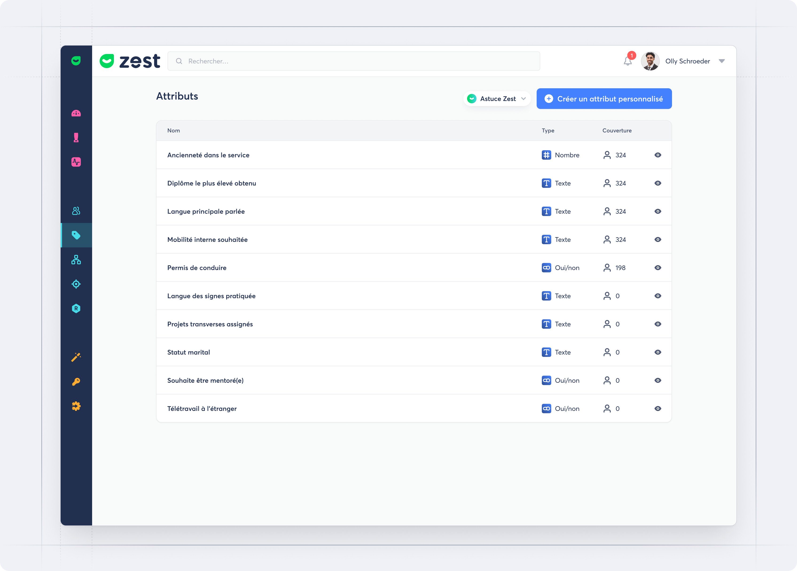 En tant que SuperAdmin, vous pouvez désormais accéder à une nouvelle section dédiée dans le back office pour créer et modifier en autonomie des attributs personnalisés. Ces attributs permettent de structurer les informations clés de vos utilisateurs et jouent un rôle central dans de nombreuses fonctionnalités de Zest.
