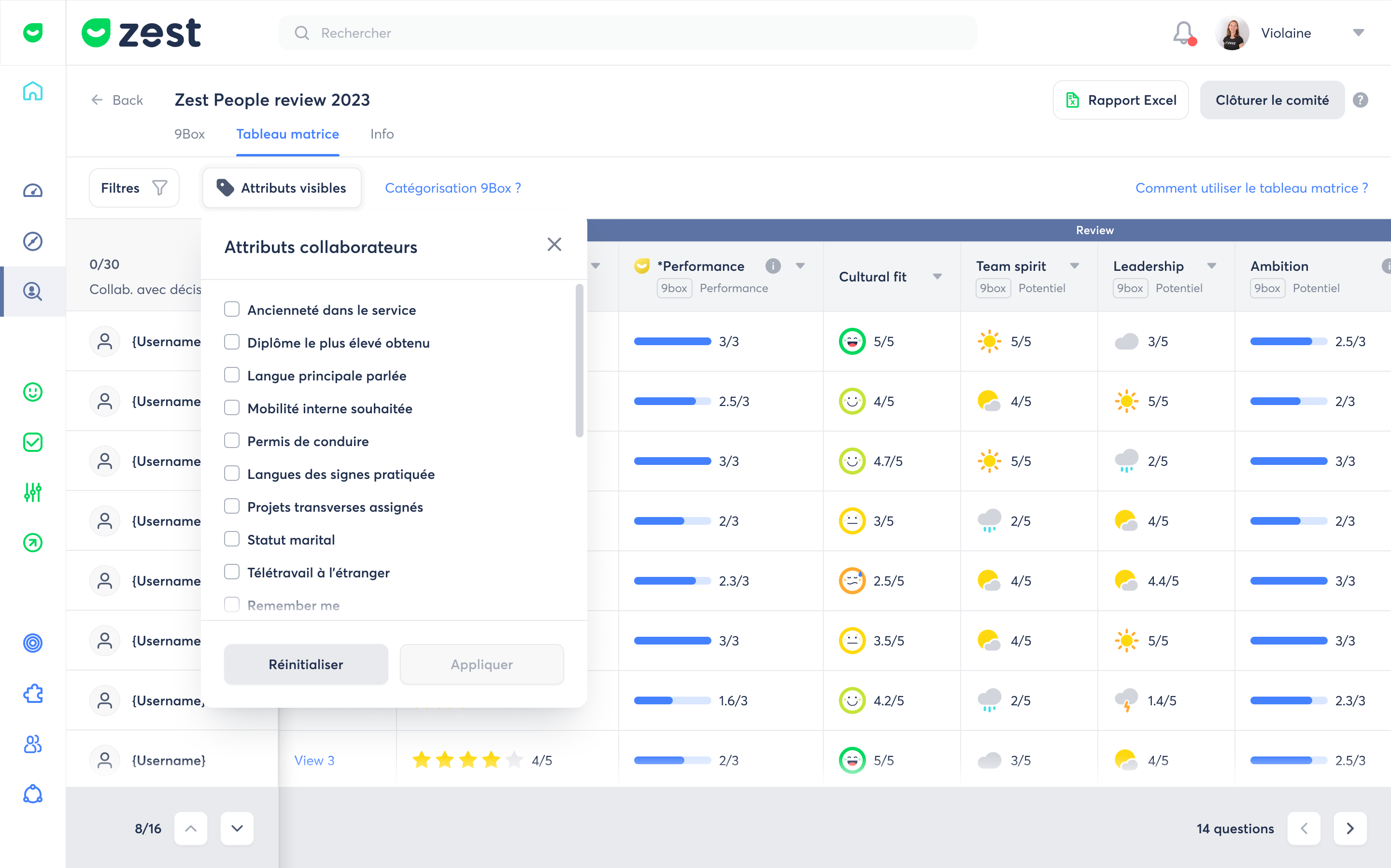 Cette nouvelle fonctionnalité permet aux membres du comité d’afficher directement dans la matrice les attributs clés des collaborateurs (métier, date d’entrée, équipe, etc.).